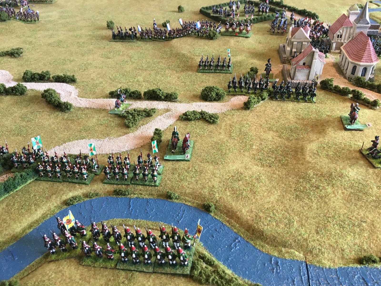 On the French left a cavalry brigade has set up to the left of the stream with the aim to threaten the open Russian right flank. Two infantry brigades have squeezed in on the other side of the stream with the town as their immediate objective.